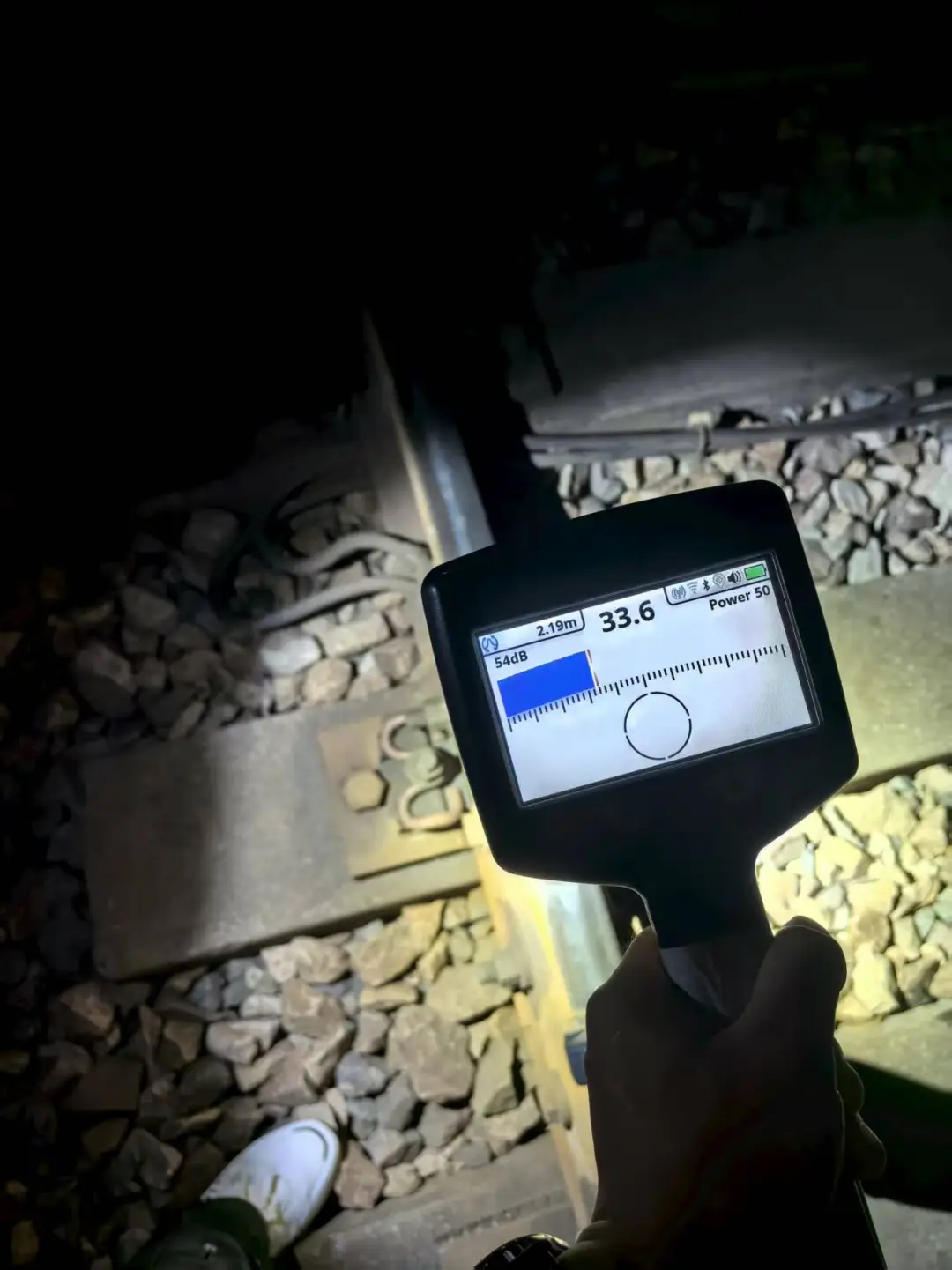 • 当操作员在轨道附近使用接收机(如Power 50档位)探测时,仪器主要接收并显示了来自铁轨本身的强干扰信号,信号强度高且稳定。