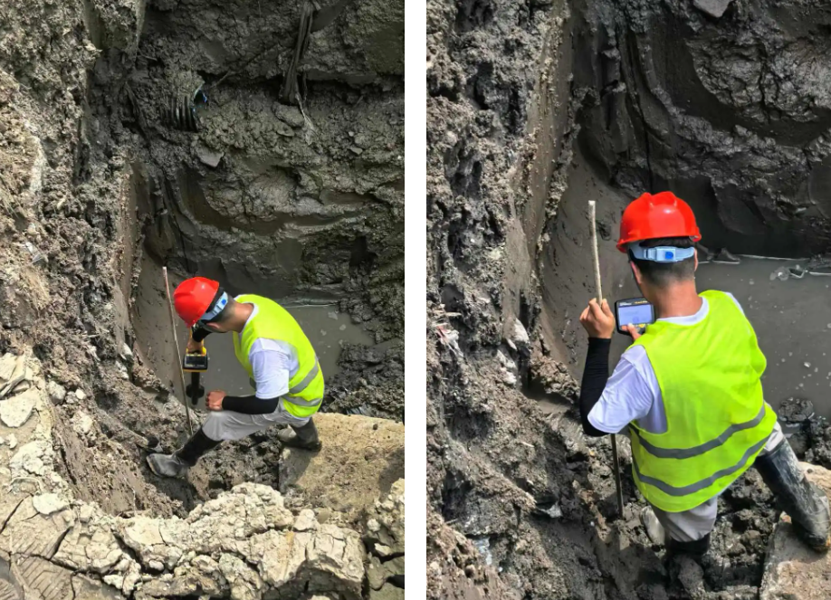 为了进一步验证探测结果的准确性,客户将接收机带到坑底进行探测。令人欣喜的是,坑底的信号依然稳定无干扰,且探测出的深度与客户之前埋设电缆的深度基本一致。为了确保深度测量的一致性,工作人员又将发射机换成25W功率的,同样选择8.19kHz频率进行探测。结果显示,其测深深度和定位的管道位置与10W发射机探测的结果完全一致。