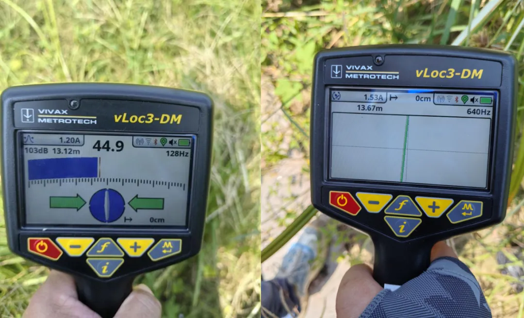 在测试桩位置,将发射机连接至2号管道的连接线上,并选择128Hz作为初始工作频率。随后,使用接收机对2号管道的走向进行探测。探测结果显示,2号管道与此前已测试的1号管道呈交叉X型走向,且此时测得的管道埋深约为13.12米。为进一步验证探测结果,将频率更换为640Hz,并相应调整接收机的工作模式后重新进行深度测量。在该频率下,测得的管道深度为13.67米。